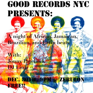 Never ones to succumb New Year party peer pressure, the 106thstreeters headed out to Williamsburg to enjoy New Year celebrations one night early at Zebulon. How could we resist a line up of a few of our favorite musical things? DJs/Good Records NYC crew, DJ Lihn & Jonny Paycheck laid down music from Brasil, Africa, Latin America, and Jamaica for the price of a whiskey, beer, or herbal tea (as some in-house were drinking, hopefully spiked). While a strange crew of Billyburg kidz attempted to wow us/confuse us with handstands and strange gyrating/trashy stripper impersonations a la some creepy Patrick Dempsey/Demi Moore Hollywood shit flicks, the music was the star of the night. The music was gorgeous as was the vibe. In a mere four hours, we were able to start our New Year’s resolutions early: drink more; listen to the best music as yet created on the planet; and support local businesses that are worthy of what little money we can contribute in these hard times. Now that’s a good start to 2011.